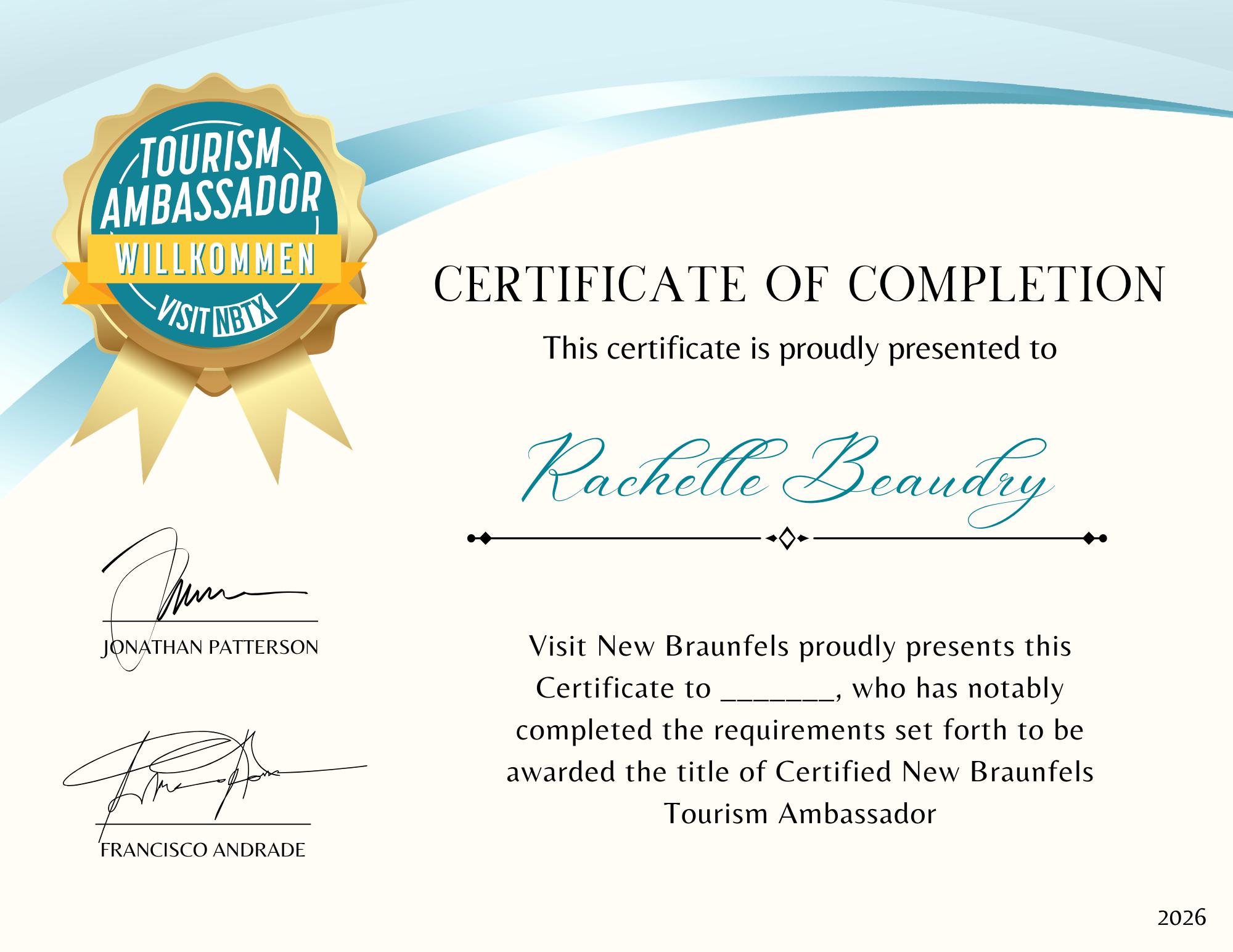 Participants who complete this program in its entirety will become certified New Braunfels Tourism Ambassadors!