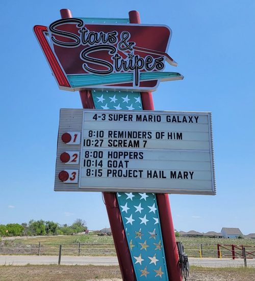 As the stars begin to appear in the New Braunfels sky, families start arriving, not for theater seats, but for the perfect parking spot for the premiere of The Super Mario Galaxy Movie at the Stars & Stripes Drive-in Movie Theater.