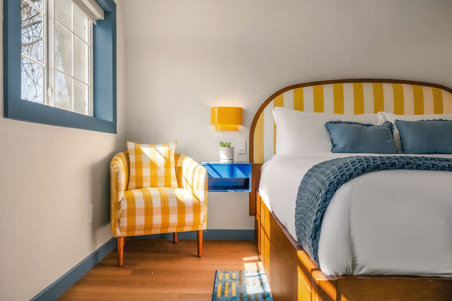 The cabins’ design is playful yet practical, focusing on a seamless, easy-to-live-in experience. French Cowboys has curated colorful, character-filled interiors that prioritize smart storage and intuitive layouts, featuring new plush beds, updated seating areas, and custom cabinetry. Fresh paint now covers the walls, beams, and trim throughout, while bathrooms have been updated with new vanities, hardware, and refreshed finishes. To better support multi-night stays, the kitchenettes now include two-burner cooktops, compact full-capacity refrigerators, and additional shelving for improved storage.