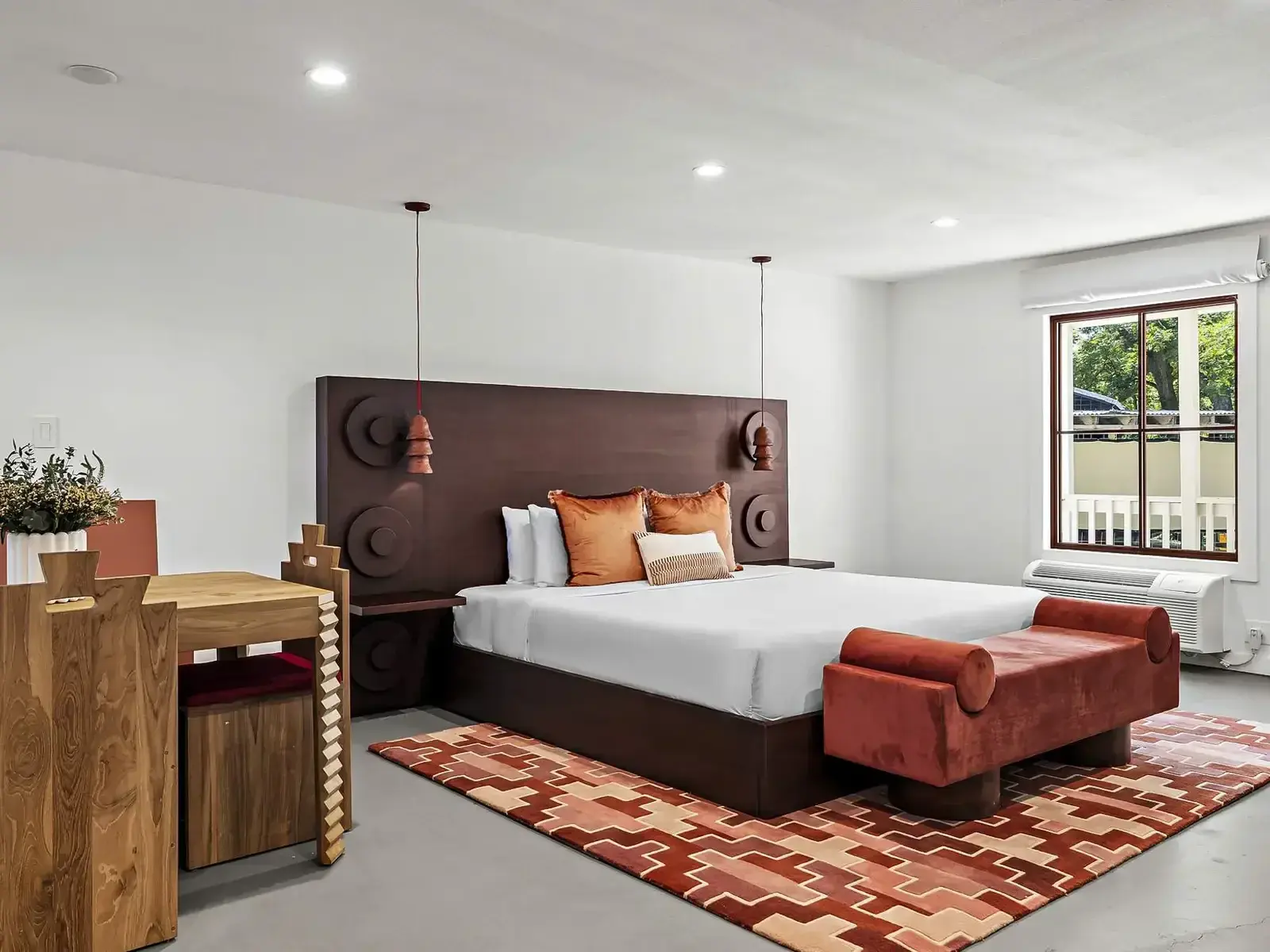 The Hacienda can accommodate up to 178 guests in a variety of room layouts including kings, double queens, and suites. Bathrooms and showers are new, and rooms are outfitted with smart TVs, plus custom steel doors and windows. Photos of guest rooms, although they are colorful, show off a streamlined sensibility.
