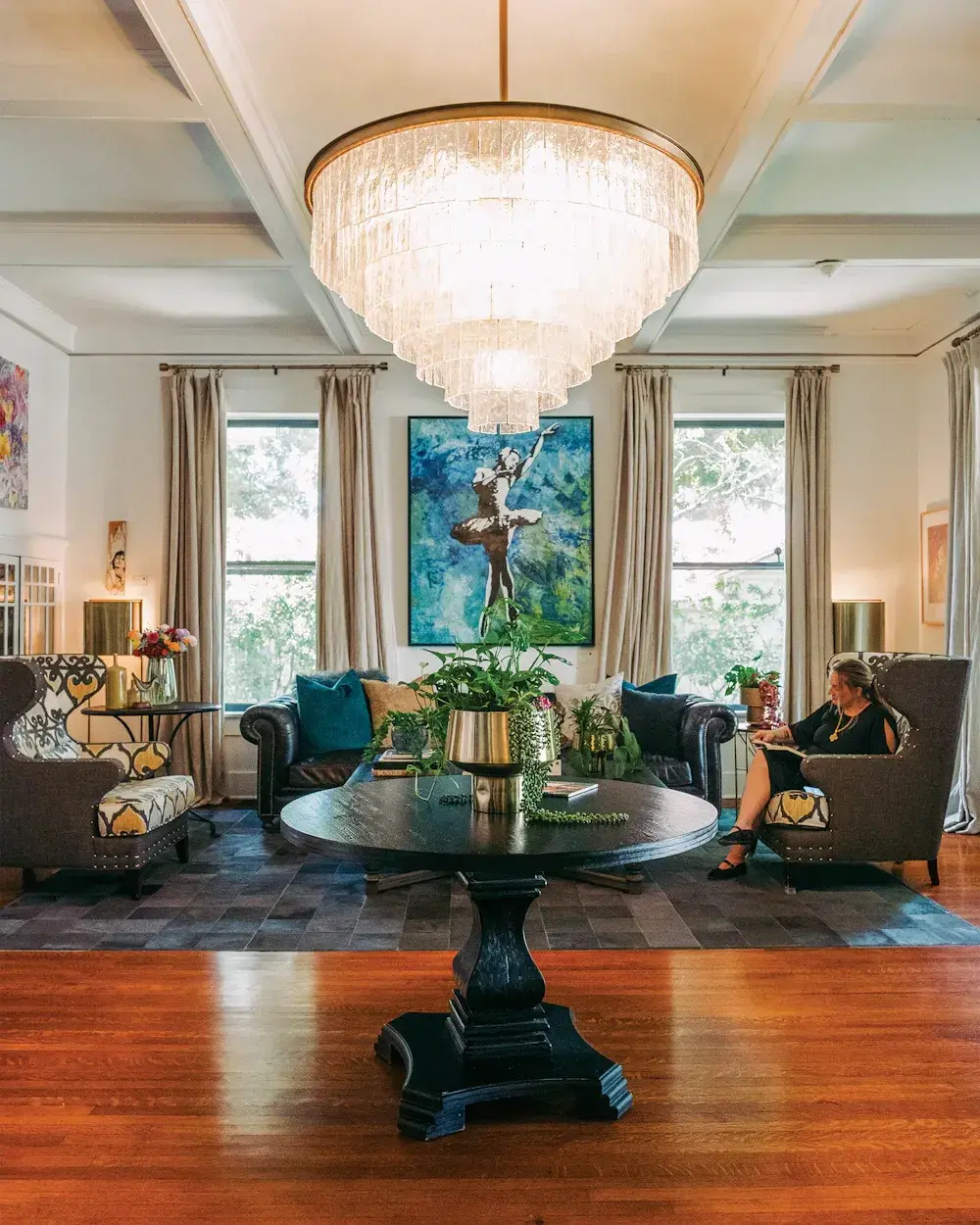 But fall calls for something cozy. You might drive right by Sophie’s Gasthaus, set back from the street and peeking out from behind manicured trees, if not for the art installation out front: a life-size bronze rhinoceros with a smartly dressed man and woman on its back, he with the head of a dog and she a rabbit. The whimsical piece by Gillie and Marc Schattner, Rhino Wild Ride, embodies the modern aesthetic of this handsome estate turned boutique hotel, built in 1906 and impeccably restored in 2021. Most of the eight suites are named for New Braunfels notables, and community spaces include a formal dining room, an enclosed bistro-style patio, and a sitting room.