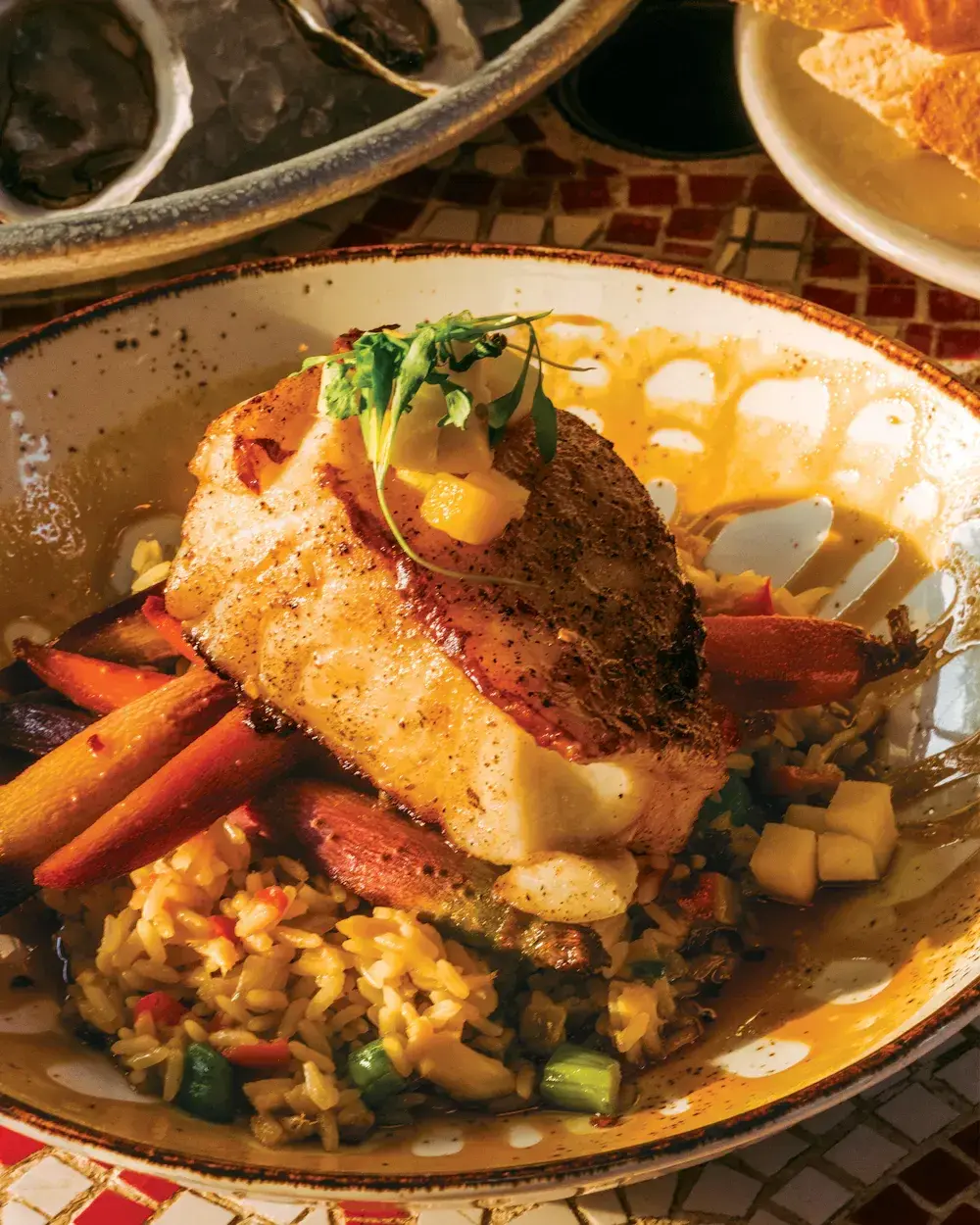 A couple streets to the east, every small room (and large front yard) of Max’s Haus is a trove of reasonably priced vintage finds such as 1960s-era Skifer snowboards and old Tonka toys. Downtown you’ll come across enormous antiques stores, as well as more easily digestible shops, many located in thoughtfully restored historic buildings. Lot 59 stands out for smartly curated vintage jewelry, wall art, and furniture in a happy cottage with gingerbread trim. Sister stores the Local and Heritage Supply sell contemporary men’s and women’s clothing and a Marfa-esque collection of fashionable books and barware. Next door to the appointment-only Lark Mason Associates (fans of Antiques Roadshow will know that name) is Brackish Goods, a river-themed boutique of upscale sundresses, swimsuits, and hats. The Chapter & Co., housed at the site of the town’s first bank, is a two-story coffee shop and bookstore warmed up with area rugs, cozy reading nooks near floor-to-tin-ceiling windows, and an inventory dominated by romantasy.