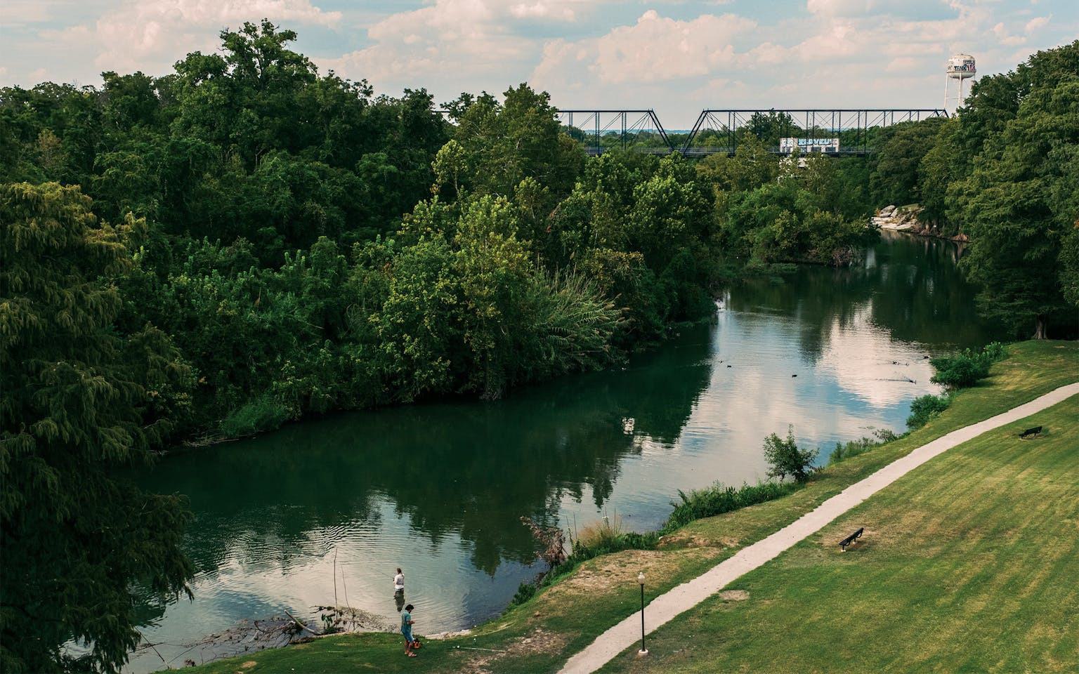 Check out the Faust Street Bridge, a stately wood-and-wrought-iron truss bridge constructed in 1887 (one of the last to be built in Texas) to facilitate the crossing of the Guadalupe River by supply caravans and travelers of all kinds. Morning is a fine time to join cyclists and walkers on the more than 640-foot span over a placid stretch of river, where egrets fish from limestone ledges and people do the same from motorized kayaks. In the background on the northern side are a dam, railroad bridge, and abandoned textile mill that viewers of Fear the Walking Dead might recognize.